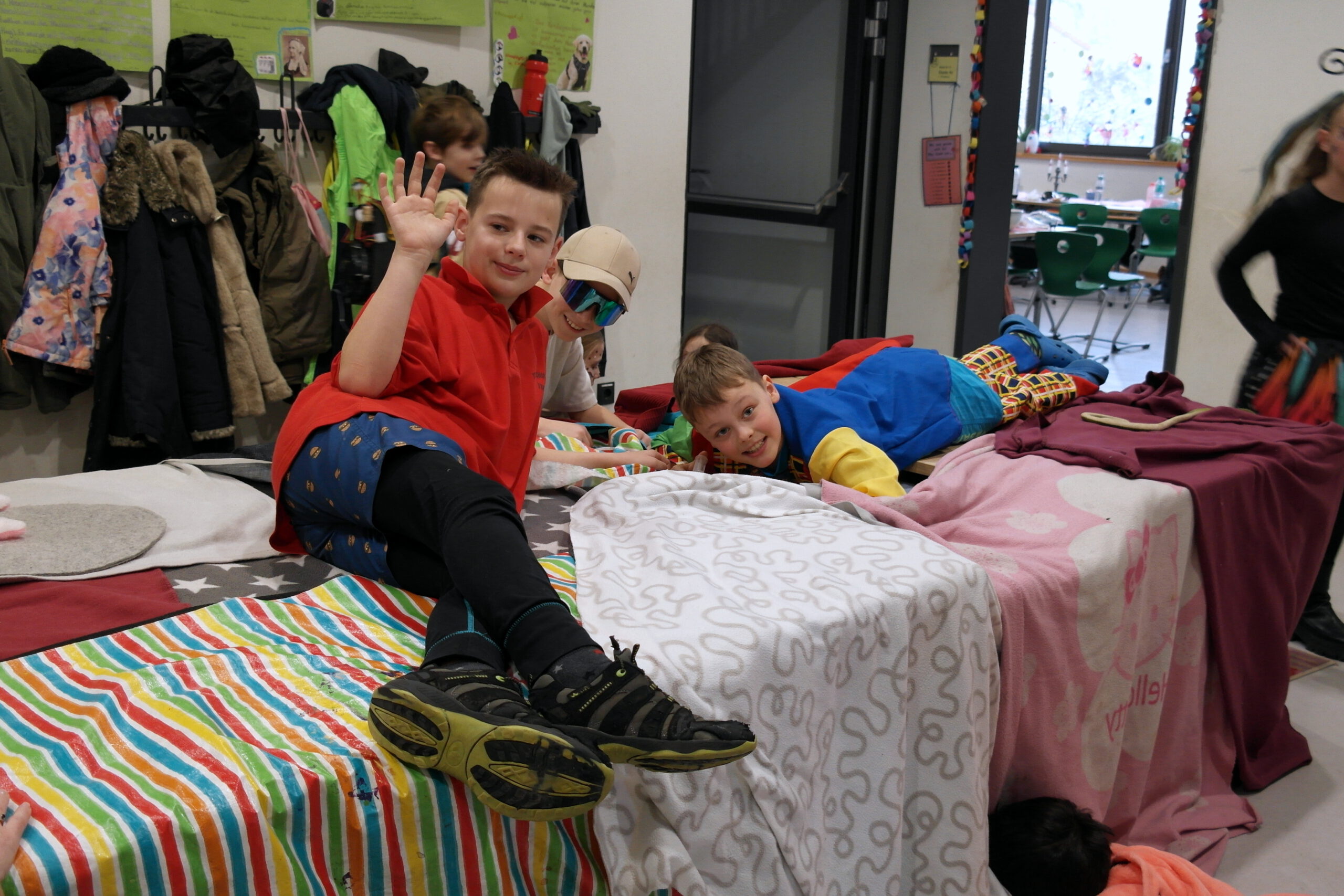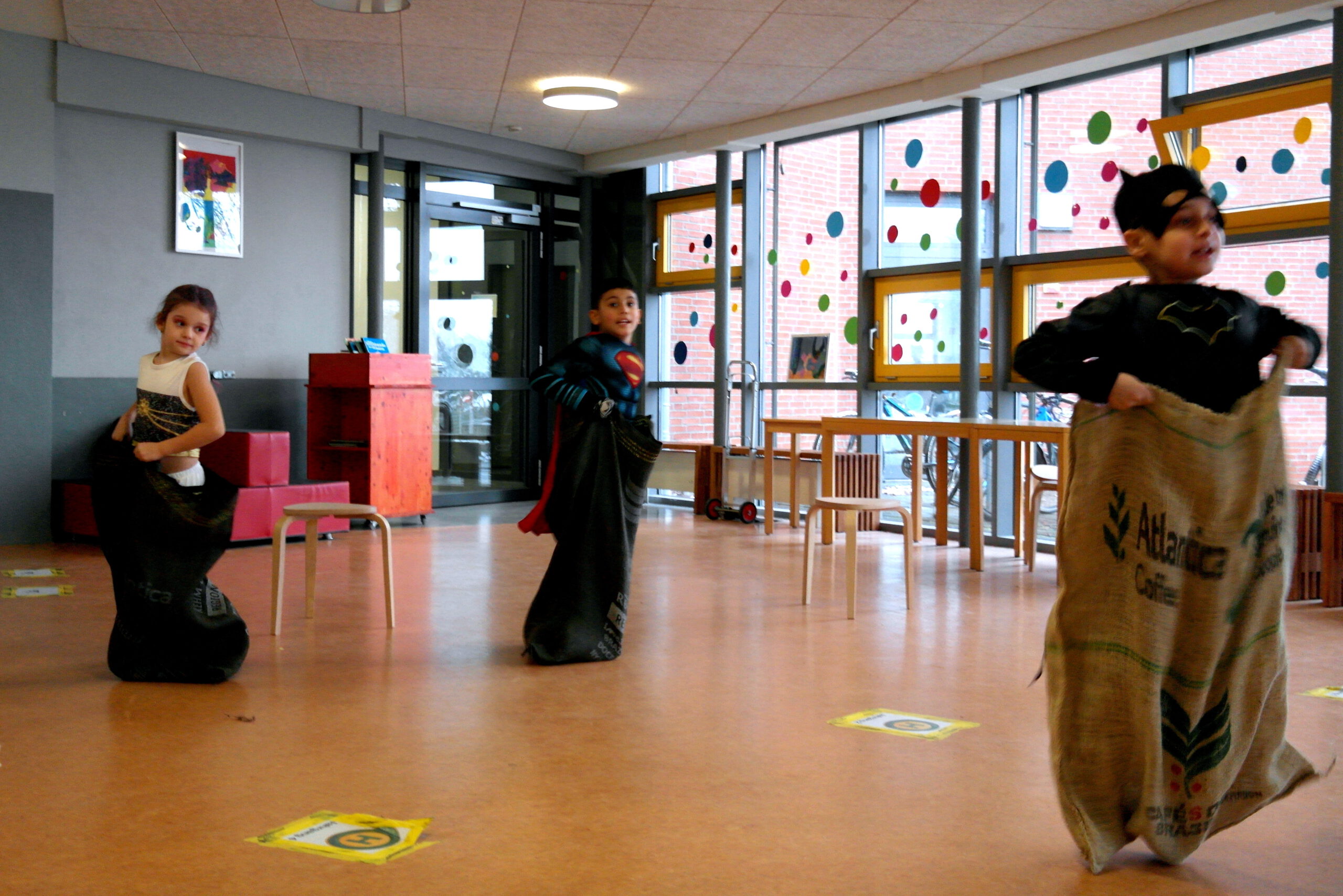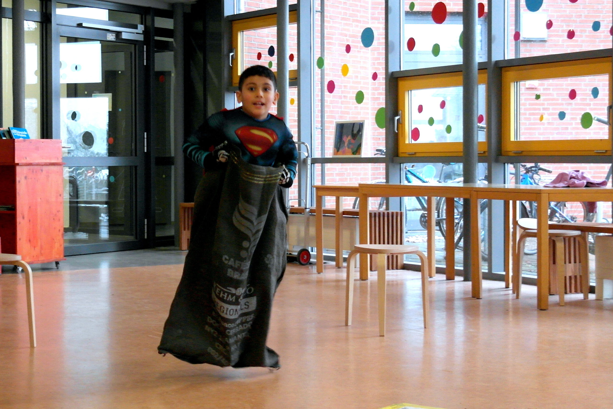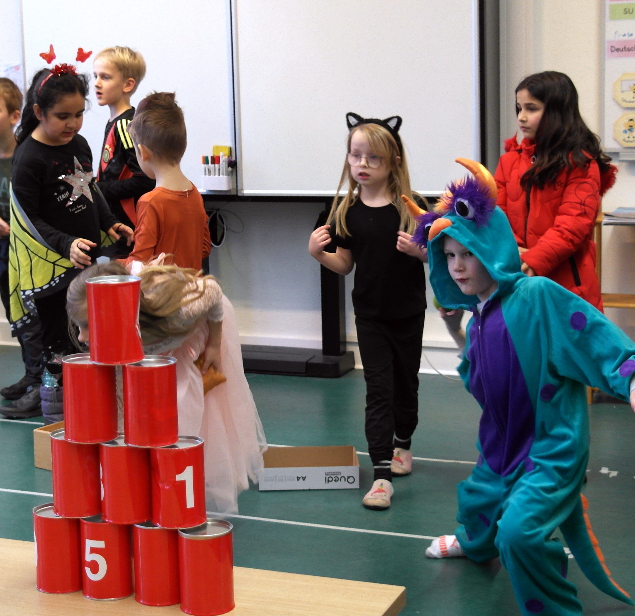 Es gab ein Buffet und lustige Spiele. In jedem Klassenraum war eine Station vorbereitet. In der Sporthalle war Disko.