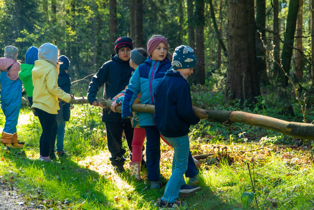 Der Wald bot die perfekte Kulisse für eine praktische Unterrichtseinheit der etwas anderen Art. Zunächst suchten die Kinder im Wald nach unterschiedlichen Formen in der Natur. Wer findet etwas Rundes? Wer entdeckt etwas Spitzes oder etwas Langes?